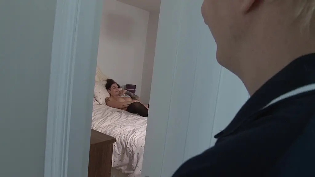 MILF Lucie s husband is late getting home so she decides to pleasure herself. Her husband comes home & watches her through the open door before joining her on the bed to fuck & creampie her.