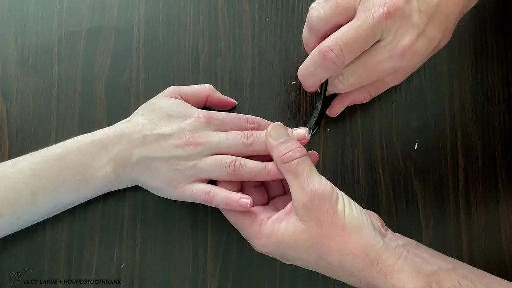 Lucy LaRueClose-up intimate overhead view of a pair of large veiny mature male hands using nippers to trim the natural fingernail tips on a young woman’s small hands.