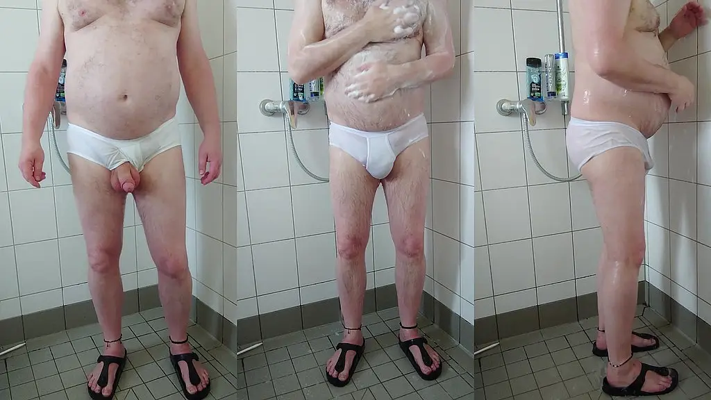 NylonjungeDraußen war es wunderschön und ich war in meinen Birkenstock Sandalen und der weißen Unterhose auf einen Spaziergang unterwegs. Völlig verschwitzt und mit voller Blase kam ich wieder daheim an und werde jetzt Duschen. Um Abwasser zu sparen stelle ich mit der weißen Unterhose ins Badezimmer und lasse einfach meinen Urin sprudeln. Der Natursekt tränkt den Slip, läuft an den Beinen hinab und sammelt sich in den Latschen. Danach wird geduscht - alles schön Einseifen inklusive der Unterhose und so kann er auf die Leine zum Trocknen und für den nächsten Tag bereit sein. Abspülen der Seife natürlich nicht vergessen und dann auch den molligen Körper abtrocknen.