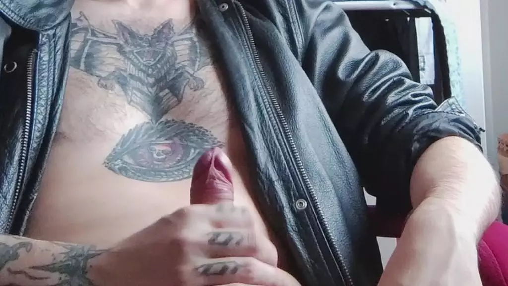 сексуальный молодой бык в коже поглаживает огромный член, татуировки на венах, грязные разговоры, глубокий голос, горячий эмо-гот