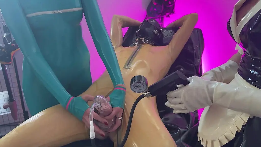 Femdoms Rubber & Stacey Quartz tease the male sub Perv into submission with a handjob and penis pump!