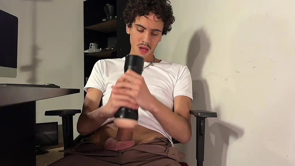 Novinho ficou sozinho no escritório e foi logo se masturbando