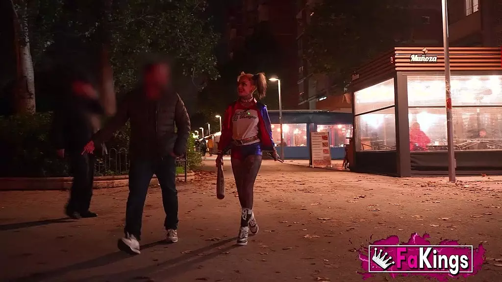 FakingsЛеди Медуза снова приходит к нам, готовая принять наш сексуальный вызов на пикап: она собирается надеть свой костюм Харли Квинн и соблазнить случайных парней по всему Мадриду. Кто из них станет порно-жеребцом?
